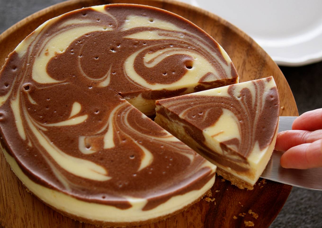 - Use a spoon to stir slowly while drawing circles, create a marble pattern. Since the cheesecake bakes in a water bath, place the pan inside a larger pan or cover the pan with aluminum foil to prevent the water from seeping in during baking.